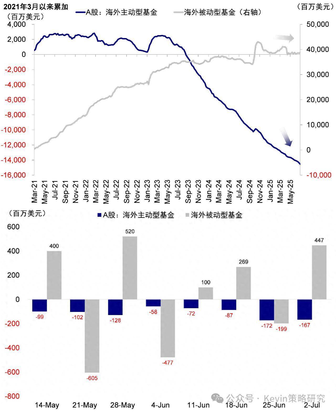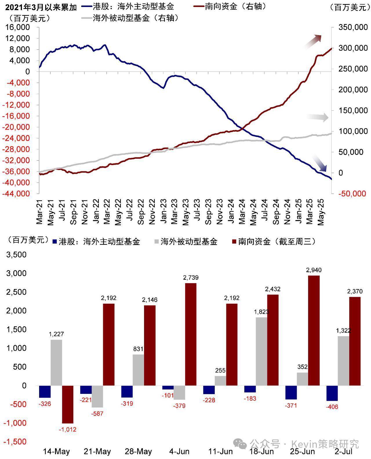 智通财经APP获悉,中金策略研究团队称,外资方面,过去一周,EPFR口径下(截至周三):主动外资继续流出,流出A股1.7亿美元,流出规模与上周基本持平;流出港股和ADR 4.1亿美元(vs. 上周流出3.7亿美元);流出较多的为专注中国和全球新兴市场等类型基金。被动外资转为流入,A股流入4.5亿美元(vs. 上周流出2.0亿美元);港股和ADR大幅流入13.2亿美元(vs. 上周流入3.5亿美元),流入主要是专注中国与新兴市场的基金。