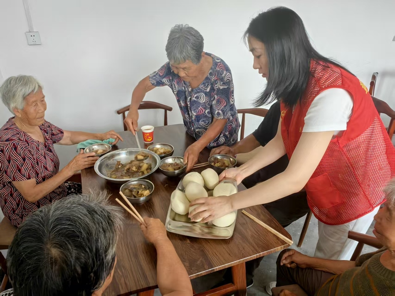 “以前自己做饭,热一顿吃两顿,现在每天都能吃上热乎菜,还有年轻人陪我们说说话。”文祖镇水龙洞村的张奶奶道出了许多老人的心声。“长者互助食堂”用实际行动诠释着温暖:每日清晨将精心搭配、少盐低脂的营养餐食配送至各村,特意为牙齿松动的老人准备软糯适口的蒸菜,为高龄长者熬煮润肺养胃的药膳粥。分餐时,年轻人们总会主动围坐在餐桌旁,一边帮老人盛饭添汤,一边听他们讲述泛黄的往事——那些关于青葱岁月的絮语、邻里街坊的旧事,在氤氲的饭菜香中化作最珍贵的时光胶囊。如今,这份带着人间烟火气的关怀正在持续传递,温暖的接力棒正一村接一村地传递下去,让更多银发族的餐桌上不仅有热腾腾的饭菜,更有被温柔以待的岁月。